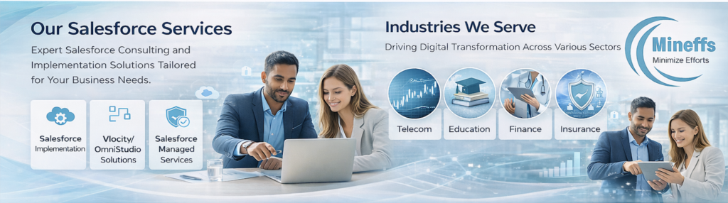 At Mineffs we deliver comprehensive Salesforce solutions with strong expertise in both Core Salesforce and Salesforce Industries (Vlocity/OmniStudio).